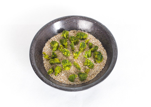 Place broccoli florets on a “soil” of popped amaranth seeds. The popped amaranth is made by dry roasting the seeds (1 Tsp at a time) in a non-stick pan with a lid. Roast for a minute or two until most seeds pop (similar to pop-corn). Add salt and pepper to taste.