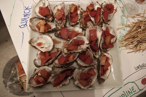 Spoon several pieces of quince and syrup into oyster shells and serve with bamboo skewers.