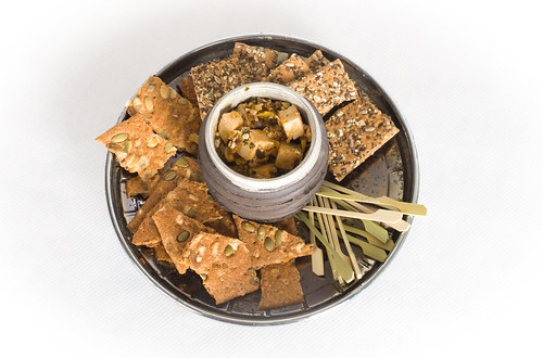 Mash silken tofu with harissa, olives, ginger, dried apricots, (wild) garlic and onion. Cut firm tofu in rough cubes and fry in coconut oil until brown and crispy on the edges. Add the silken tofu mash and stir-fry for a few minutes. Cool down, store in airtight container and keep in the fridge overnight. Serve with rice, grains or rough crackers.