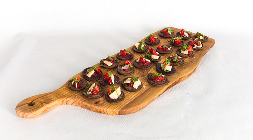 On each blini layer small amounts of: strawberry pulp, cheese, honey (tiny drop), coulis, basil leaf, freeze-dried strawberry and pepper.