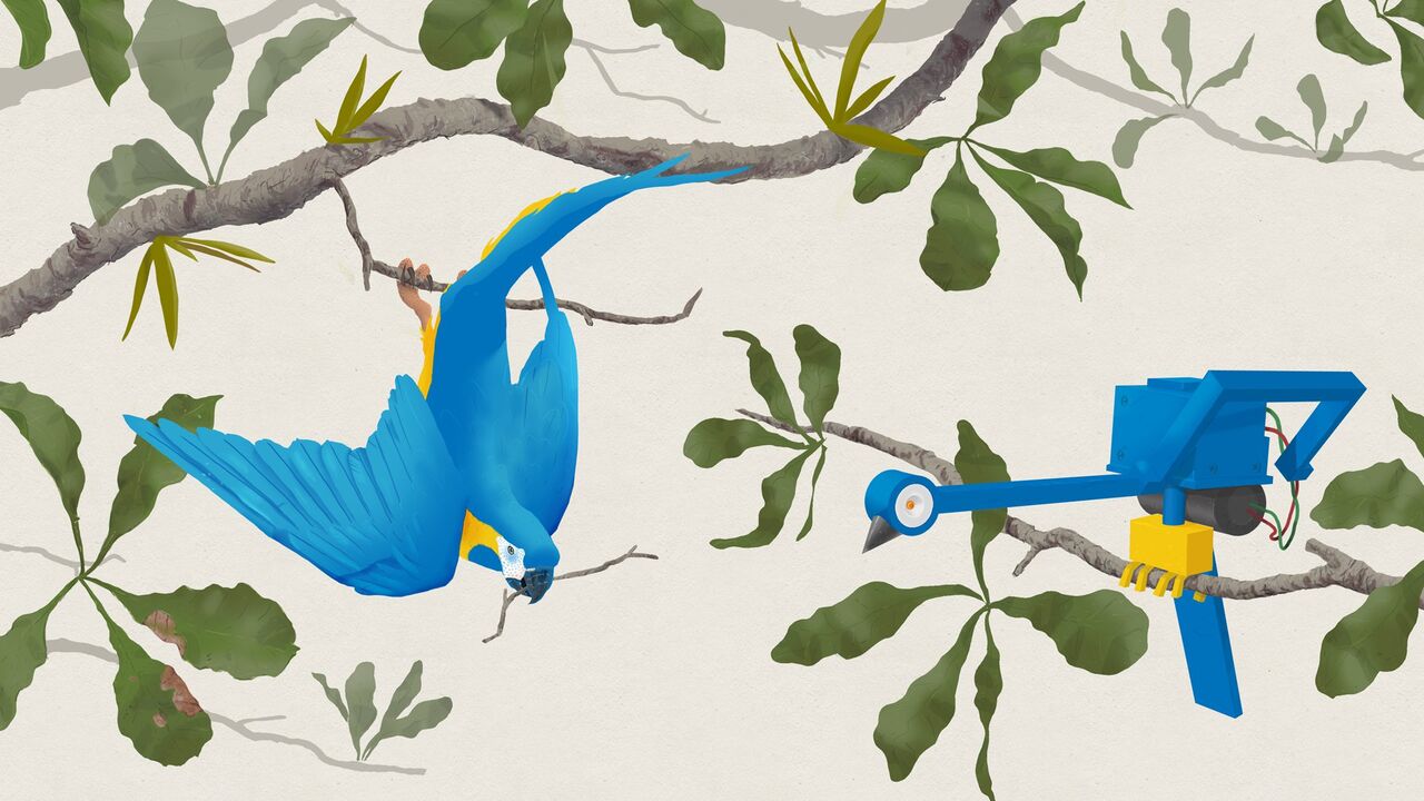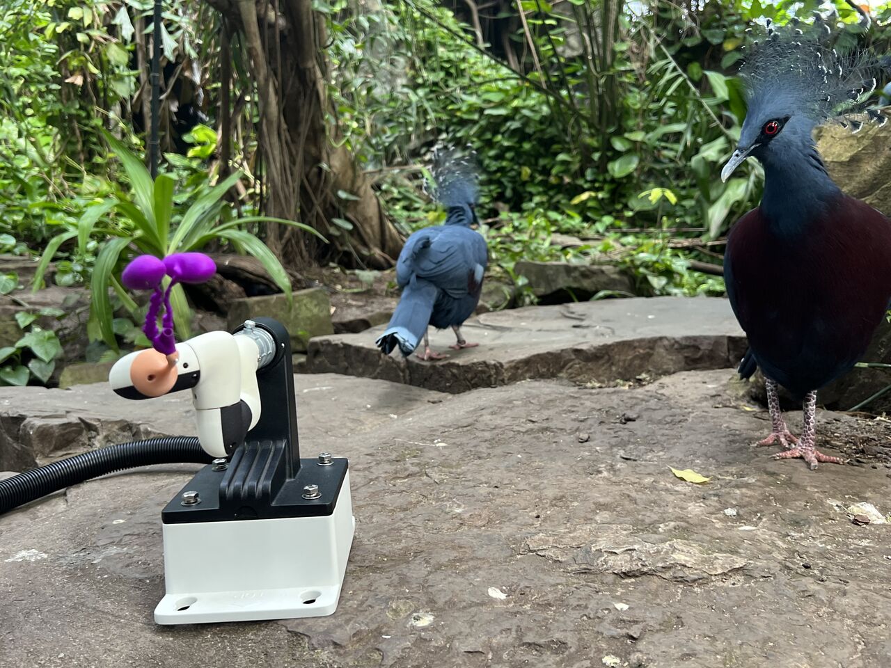Pidgin Smidgen by Ian Ingram attracting a Victorian Crowned pigeon by mimicking its mating dance, in the Tropical Greenhouse in ARTIS Amsterdam Royal Zoo during Machine Wilderness 2022