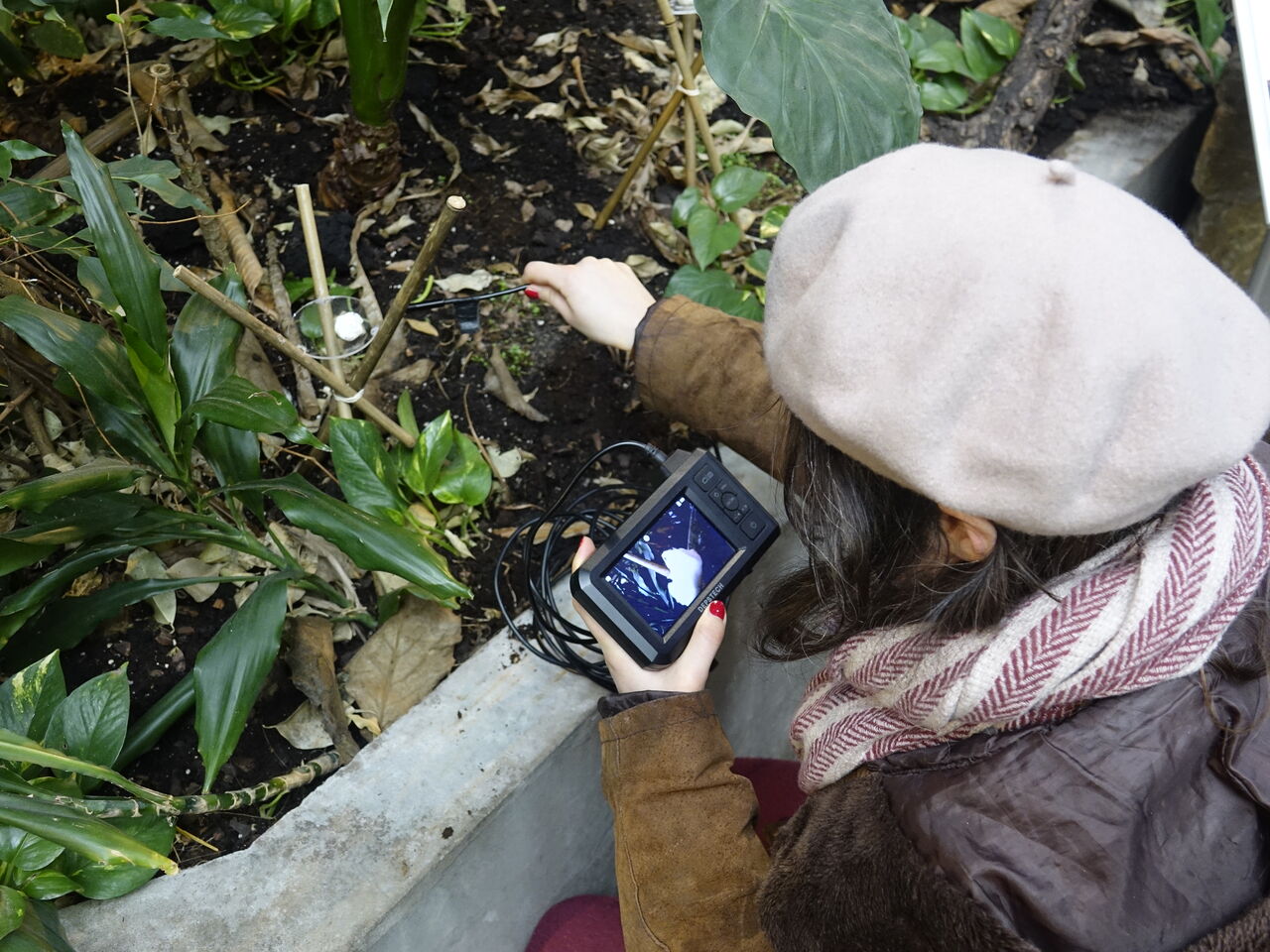 a visitor exploring Ant Observation Station set up by Heather Barnett during Machine Wilderness in the Gorillahouse at ARTIS Amsterdam Royal Zoo 2022