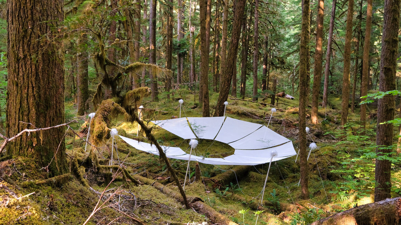 Machines at landscape-level: Brian House installing his Macrophones listening to infrasound in Willamette National Forest.