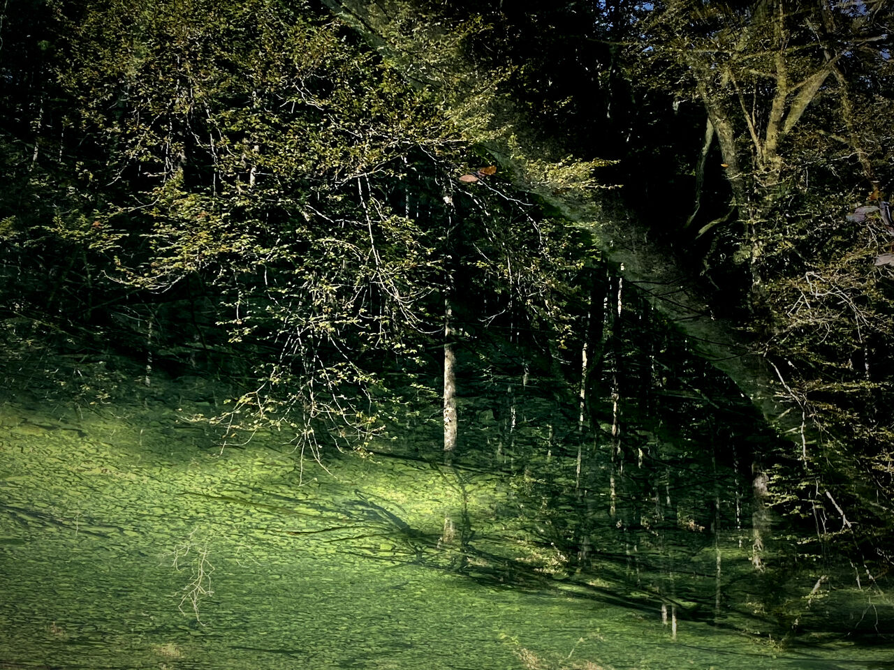 As the trees unfurl their leaves, the very air tints green. Dripping, greening, invigorating. Sun rises above the canopy, irradiating the colour into shimmering green hues Fern, grass, emerald, olive, moss, malachite, myrtle, pine, sage, lime, jade, laurel, grass, forest, jungle, cadmium, chlorophyll, swamp, seaweed, sap, verdun, viridian. . I can feel the greening energy plucking the same strings in the plants, in the air and in me. I am not a plant. Yet there are parts of me resonating, animated by this wondrous greenness. I'm soaked through with it. It emanates from my skin. It exudes from my voice, and from the voices of others, in a greening polyphony. I stop, prostrated on the Earth, for a moment or an eternity, and listen to freshness. The otherwise of the botanical, the expanding and exploring and re-converging on the deeply alien omnipresence and entanglement.