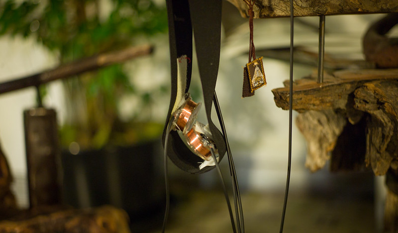 Plastic dishes of MYA (malt, yeast, agar), necklace-like, strung together on coils of thin copper wire; a hanging garden of reception and transmission, rough interface to the mushroom mind. On the FM band: power line undulations, low frequency pulses, phase shifts manifest, chatter.