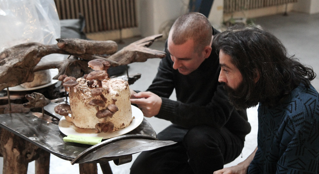 Radio static saprophytics humming in mute backgrounds, chance shifts to patterns of cross-spore germination between two parallel wide area networks; between radio-based communication technologies and the single organism network of the mycelium; between the moment and the shadow. Fungal transceivers sprout mycelial antennas, a forest on the head. The influence of electromagnetic carrier wave on the mycelial network asks to be examined.