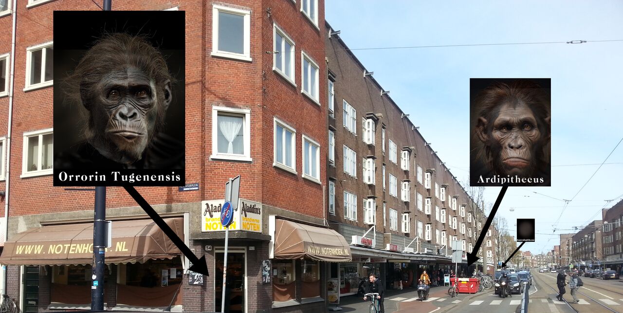 The human hereditary line splits from gorillas at an eerie vitamin store 8.5 million years ago, and splits from the chimpanzees about a block further, at the toy shop. Orrorin tuchenensis emerges at the Aladdin dried fruit and nut shop on the corner, just over six million years ago. Only a few uncovered bone fragments hint at their presence in the depths of time. Our common ancestry remains unclear. Some scientists argue they are part of the chimpanzee evolutionary branch, some say the human branch. But as fruit and nut-eaters, they seem at home in this dried fruit and nut shop. As I walk down the road, Ardipithecus rummage through cookware in the utensils store.
