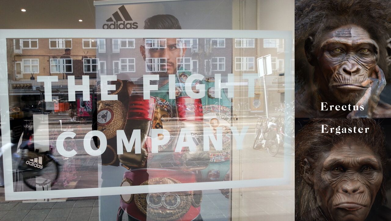 The street has six blocks. Its unknowing pedestrians transect six million years, a million years per block. What was once my route to the supermarket is now an epic journey through human evolution. At the halfway point, in the deep, dark grotto of a Turkish diner, a Homo habilis family feast fervidly on bone marrow. Their shadowy contours betray the first known use of stone tools, used to crack open the bones of carcasses left by lions and other big predators on the savanna. At Fight World, the kickboxing supplies shop that never has any customers, Homo ergaster and Homo erectus appear as sparring partners, wearing fabulously colourful trousers and bright red gloves. Continuing my walk, I pass a few other ancestors, until, at the very end of the street, we appear. Homo sapiens occupies the very last building – a cheap-looking nail salon. That is us, just a flicker in time.